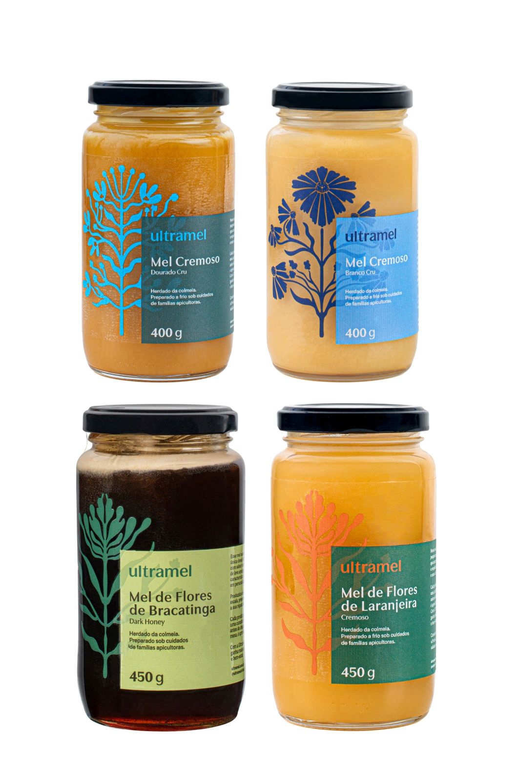 Quatro origens. Quatro perfis sensoriais. Uma experiência completa com méis puros. O Kit com 4 Méis Especiais Ultramel reúne diferentes origens e características naturais do mel, proporcionando variedade de sabores, aromas e texturas para consumo direto ou uso culinário. Todos são produzidos de forma artesanal, sem adição de açúcares, conservantes, corantes ou qualquer outro ingrediente além do próprio mel.