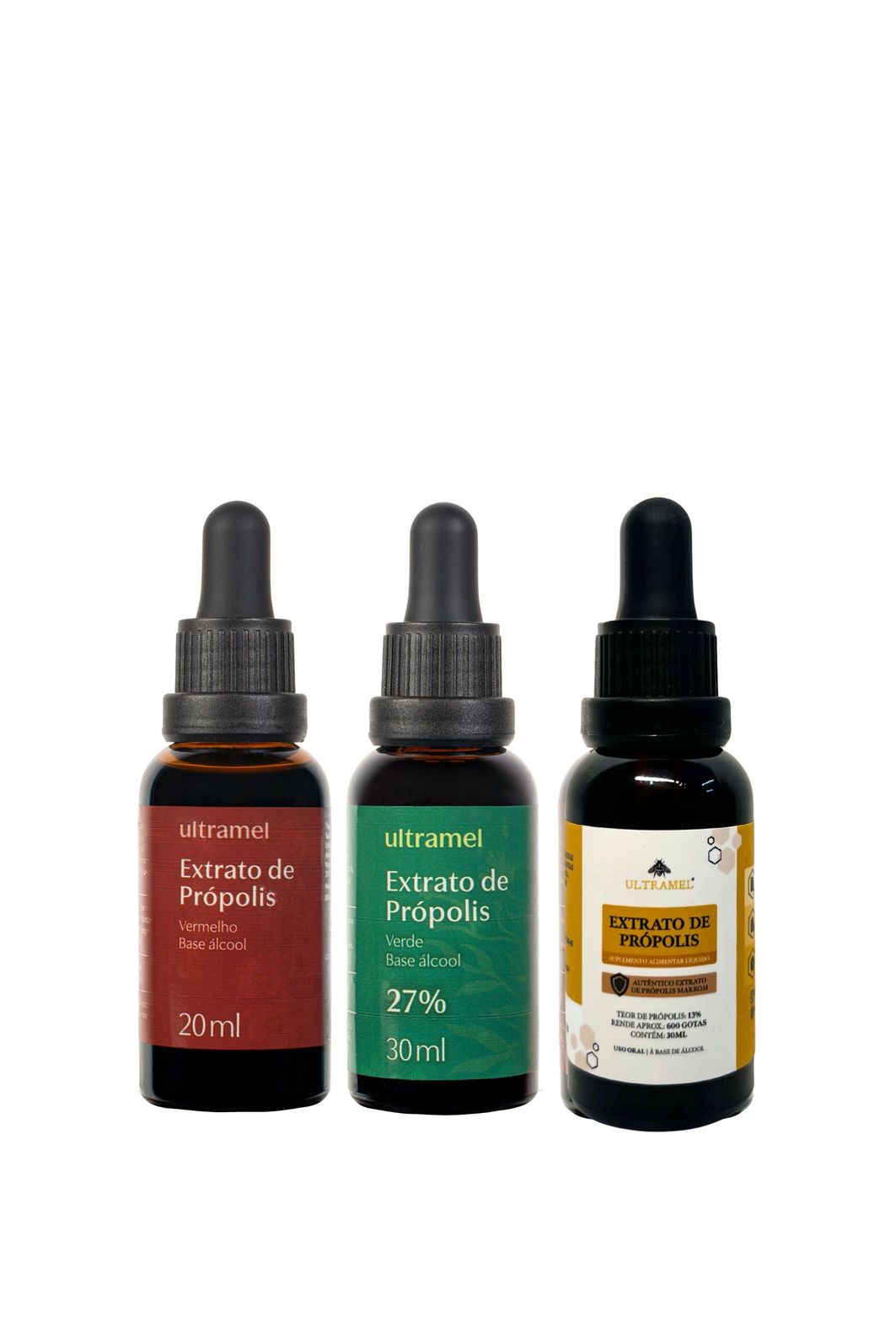 O Kit Própolis Ultramel reúne três variedades de própolis brasileiro — marrom, verde e vermelho — em extratos com diferentes concentrações, permitindo ao consumidor conhecer as características específicas de cada origem botânica.
