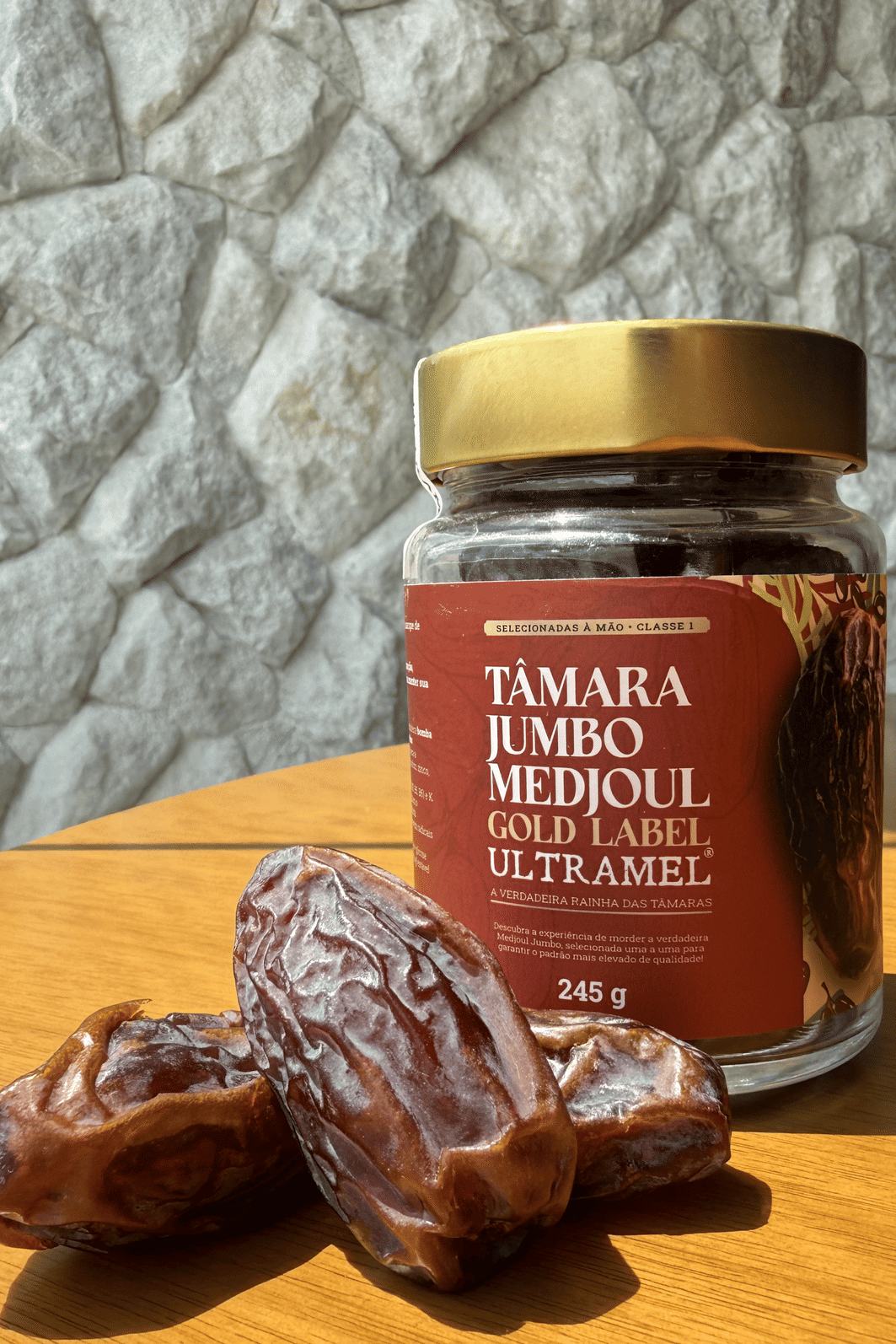 A Tâmara Jumbo Medjoul Gold Label Ultramel é cultivada em regiões tradicionais e ensolaradas reconhecidas pela produção desta variedade. Colhidas no ponto adequado de maturação e naturalmente desidratadas, apresentam textura macia, polpa carnuda e doçura característica da própria fruta.