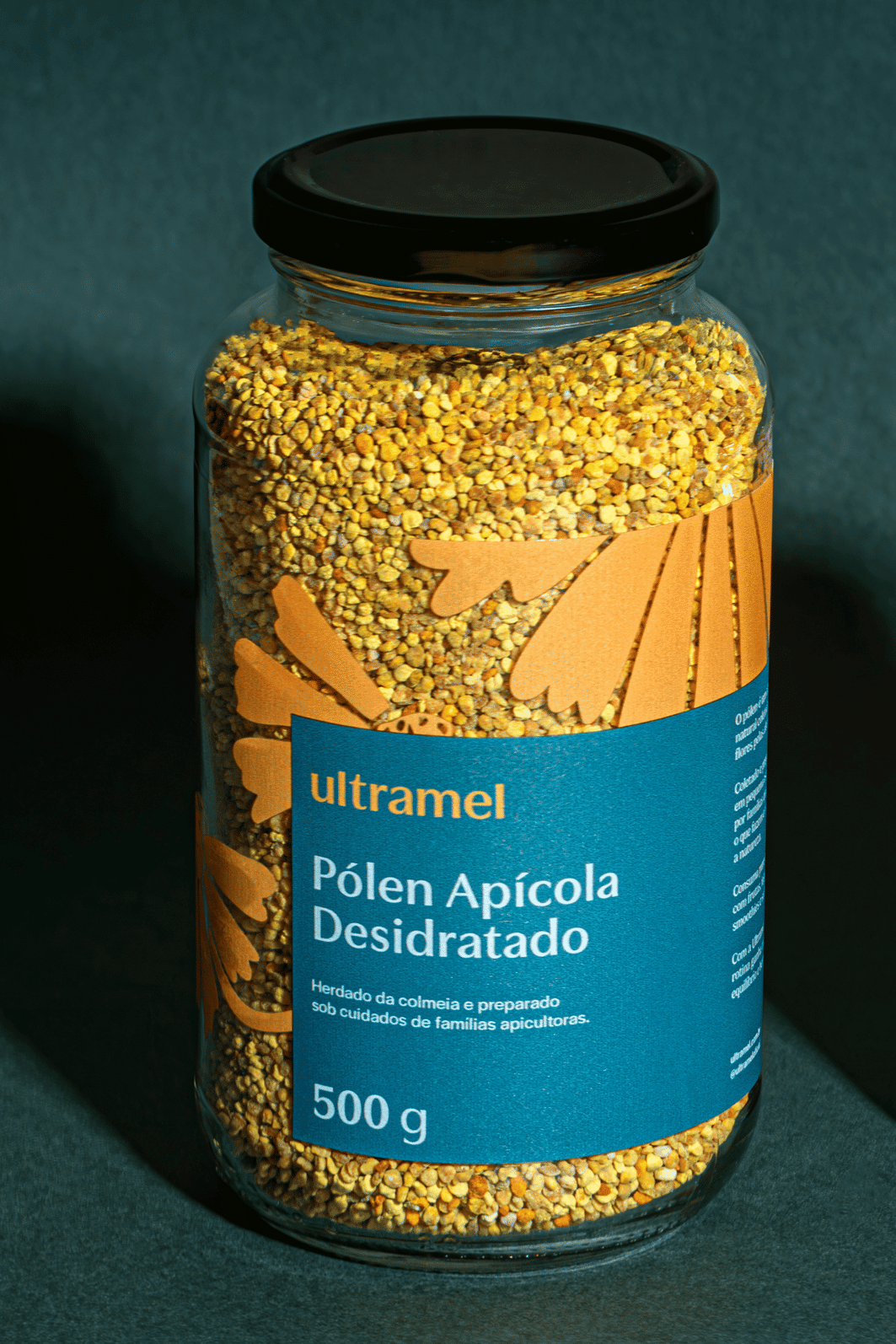 | Por que escolher Ultramel? | Produto artesanal: colhido de forma responsável, respeitando o ciclo das abelhas e o meio ambiente. Nosso pólen é desidratado a frio, com o objetivo de preservar suas características naturais, sem perdas por altas temperaturas. Um alimento cru e integral, que não passa por processos industriais, preservando a qualidade bruta do alimento. 100% natural, livre de conservantes, corantes ou aditivos químicos. Embalagem de vidro, livre de BPA, microplásticos e outras toxinas. |